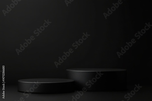 Dark circular podiums with flat tops for themes of product displays and artistic presentations on a dramatic black background