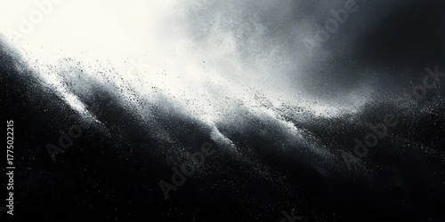 Dark clouds of fine black powder or dust being dispersed in the air against a light background creating a dramatic contrast and dynamic movement