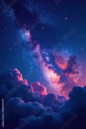 Dark clouds overlapping a starry night sky with abstract shapes and vibrant colors, glowing, dark background