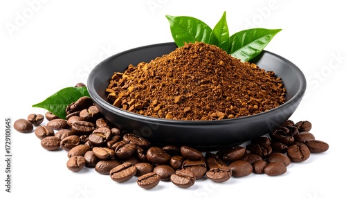 Dark coffee powder in bowl, with green leaves and coffee beans