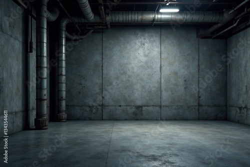 Dark concrete floor with industrial pipes and exposed ducts , texture, decay