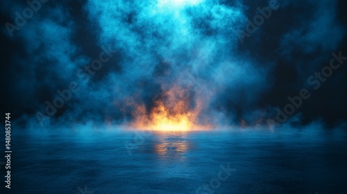 Dark cracked ground with glowing mist and dramatic blue smoke background scene.