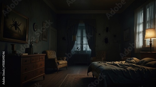 Dark, creepy bedroom with spiders, unmade bed, and antique furniture.