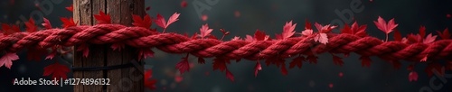 Dark crimson garland wrapped around wooden post, twine, hanging