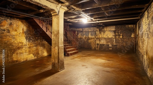 Dark, damp basement with old wooden stairs, stained walls, and concrete floor.