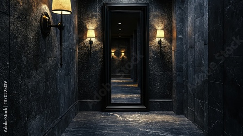 Dark Elegant Hallway with Mirror and Sconce Lighting