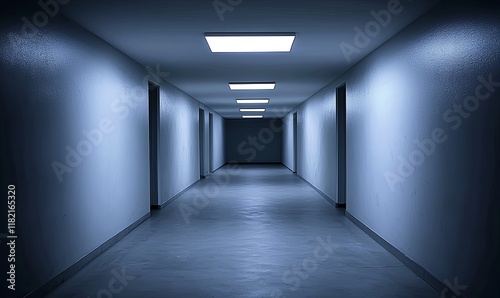 Dark, empty corridor with doors, fluorescent lights, mysterious atmosphere, ideal for suspense themes.