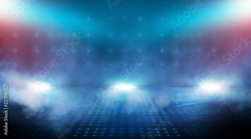 Dark empty scene, blue neon searchlight light, wet asphalt, smoke, night view, rays.
