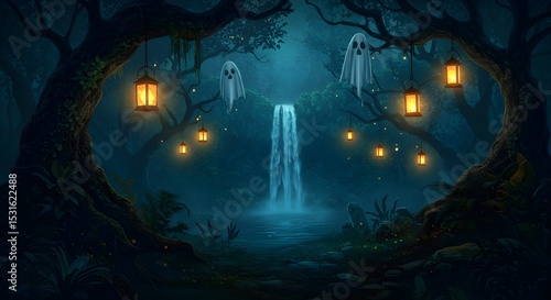 Dark Fantasy Halloween Forest with Glowing Lanterns and Photorealistic Waterfall Oasis