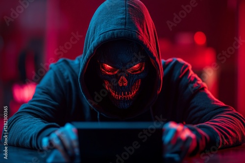 Dark figure with glowing skull mask engages with device in ominous setting at night
