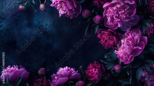 Dark floral frame with beautiful peonies festive concept.