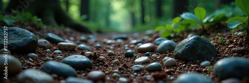 Dark forest floor with scattered moonstone pebbles, ground, minerals, terrain
