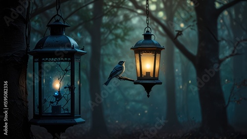 Dark forest, hanging lanterns, misty bird