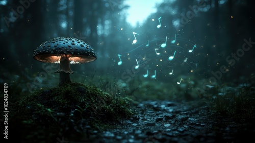 Dark forest scene with glowing mushrooms forming musical staff pattern with ghostly notes rising