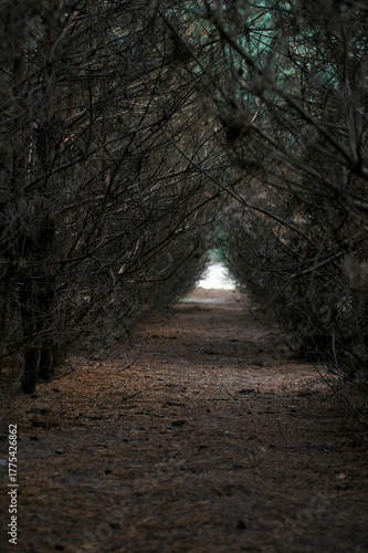 Dark Forest Tunnel with Barren Branches Leading to Light