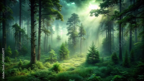 Dark forest with deep shade of mist and green with faint sunlight in background, forest, mist, trees, darkness, mysterious