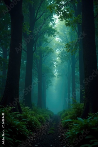 Dark forest with tall trees and overhanging branches, mysterious atmosphere, dense foliage, ferns