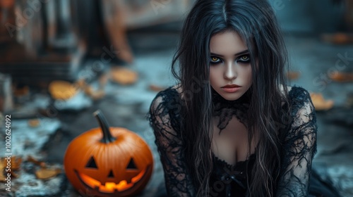 Dark Gothic Halloween Aesthetic with Pumpkins and Mysterious Girl