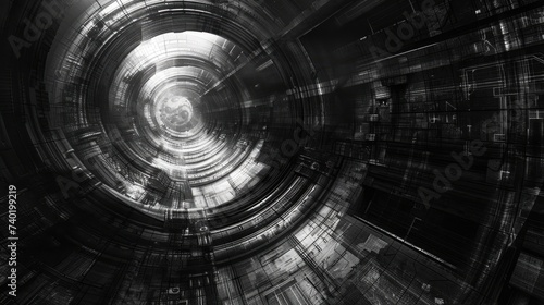 Dark gray background fog and light on floor. Mystical mist. dark room. The hypnotic geometric portal, combining straight and crooked lines, creates a feeling of incredible, game