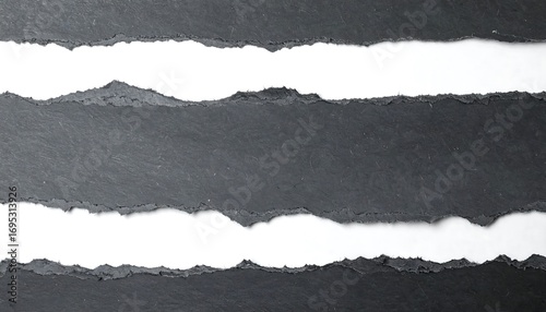 Dark gray torn paper strips against a bright white background, creating a textured and layered graphic design element.