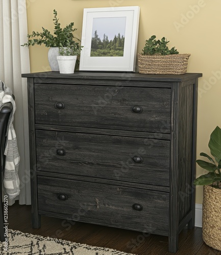 Dark gray wooden dresser with three drawers, black knobs, and a rustic finish. Potted plants and a framed photo sit on top. The dresser is shown in a