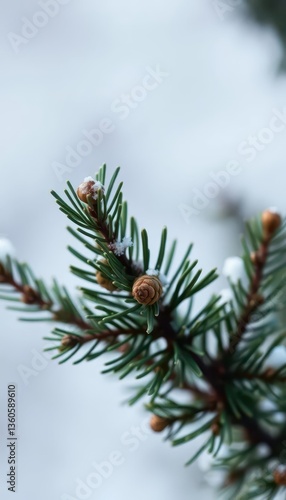 Dark green fir branch with a small, closed cone, natural winter texture, evergreen, foliage, greenery