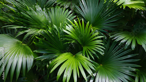 Dark green leaves of rainforest palm tree the tropical foliage plant
