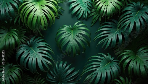 Dark green Monstera deliciosa palm leaves photo. Tropical botanical pattern with vibrant foliage. Elegant evergreen nature background. Decorative tropic leaf texture. Zoom in on exotic elegance of