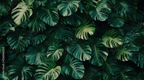 Dark green Monstera leaves overlapping in a dense pattern, forming a rich, nature-inspired background with a tropical jungle feel.