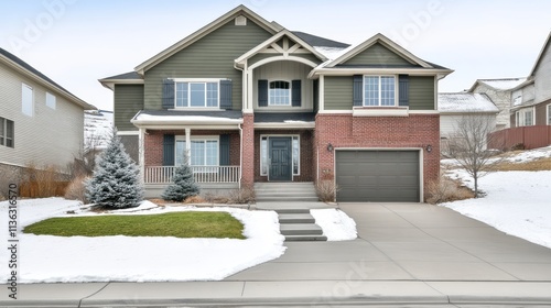 Dark green, red brick two story house with white railing in a residential area of a suburban winter neighborhood in America. Snow and pine trees. Driveway leading up to a garage, a porch.
