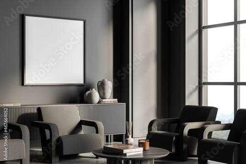 Dark grey living room with empty square canvas. Corner view.
