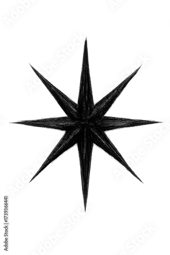 Dark Grunge Eight-Pointed Starburst Icon - Black Charcoal Hand Drawn Compass Rose Symbol with Distressed Texture