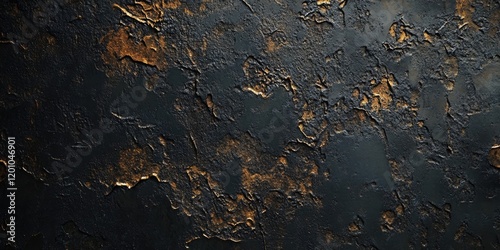 Dark grunge textured background featuring deep blacks and metallic gold accents with a rough, uneven surface ideal for background design projects