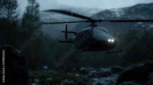 Dark helicopter flying through a stormy mountain landscape