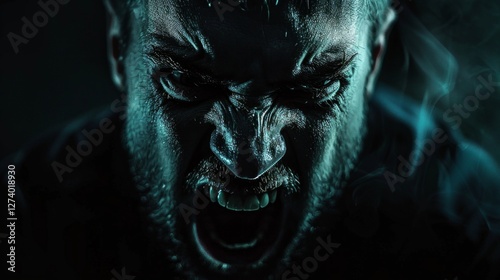 Dark image with an aggressive expression of the animal's face, creating an atmosphere of fear and tension, suitable for horror themes and thrillers.