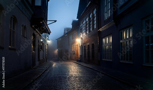 dark London street, Victorian style buildings, lots of shadows, dim light from street lamps