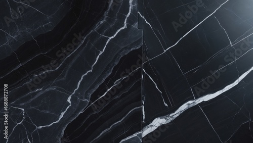 Dark marble surface with white veining. Textured stone material with striking pattern. Natural stone design for surfaces and decor.