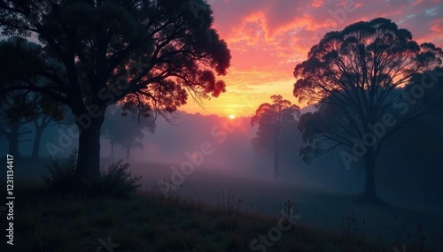 Dark mist rises from eucalyptus leaves at dusk, trees, forest
