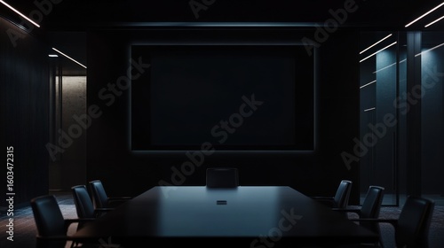 Dark Modern Conference Room Interior Design: Sleek Minimalist Meeting Space with Large Screen