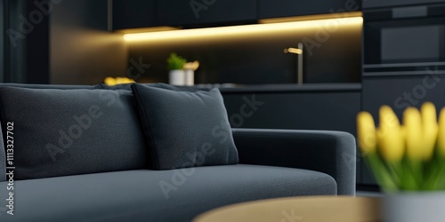 Dark modern living room with a sofa and coffee table near the kitchen counter, with warm lighting.