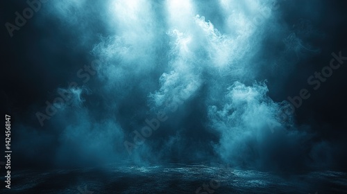 Dark, moody studio backdrop with dramatic blue smoke and lighting
