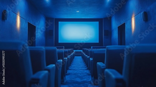 dark movie theater filled with orderly empty seats blank screen glowing softly cinematic depth perfect alignment