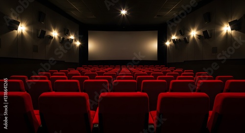 Dark movie theater with plush seats and glowing projection