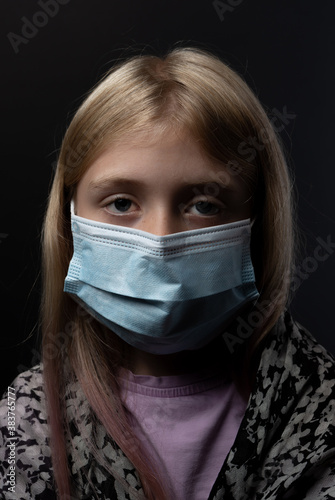 Dark portrait of a young girl with a face mask. Looking sad and worried.