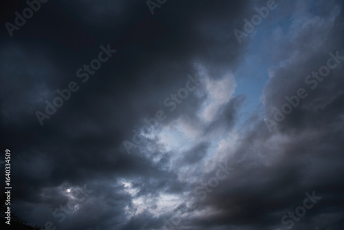 Dark rain cloud dramatic sky summer tropical thunder storm sky and fluffy black darkness cloud nearly raining cloudscape. Nimbus raincloud skyline climate background. Dark gray sky cloudy environment