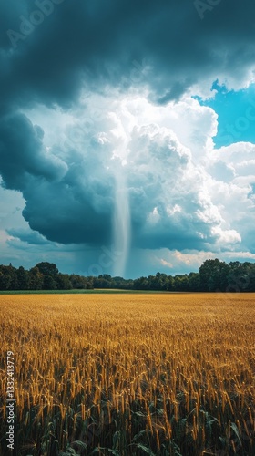 Dark rain clouds loom above a vast summer field, casting shadows over golden crops. A hint of sunlight breaks through, creating a striking contrast in the serene landscape