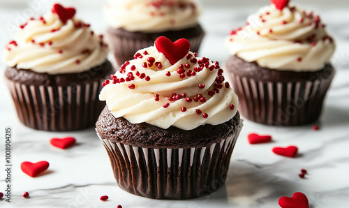 Dark red velvet cupcakes with white buttercream frosting and tiny heart-shaped sprinkles, arranged on an elegant marble surface for a Valentine's Day celebration