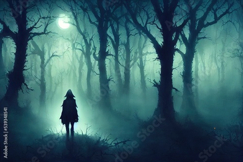 dark road through fantasy forest at night, scary halloween landscape. High quality Illustration