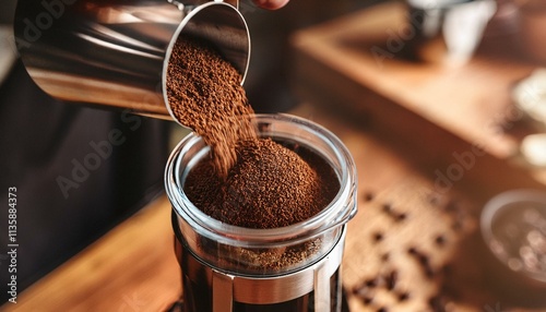 Dark Roasted Coffee Grounds Pouring into French Press: Rich, Aromatic Brew