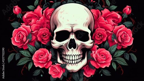 Dark Romance: Skull and Roses Illustration on Black Background - Perfect Wallpaper for Day of the Dead or Any Dark Decor